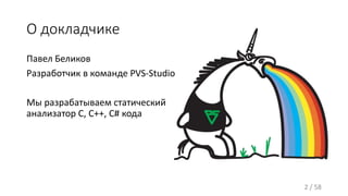 Документ представляет обзор практик безопасного программирования на современном C++, акцентируя внимание на типичных ошибках, обнаруженных в open source проектах с помощью статического анализатора PVS-Studio. Рассматриваются нюансы работы с указателями, циклами, инициализацией конструктора и использованием стандартных библиотек C++. Также обсуждается правильное применение методов, таких как std::size и std::unique_ptr для предотвращения утечек памяти и других ошибок.