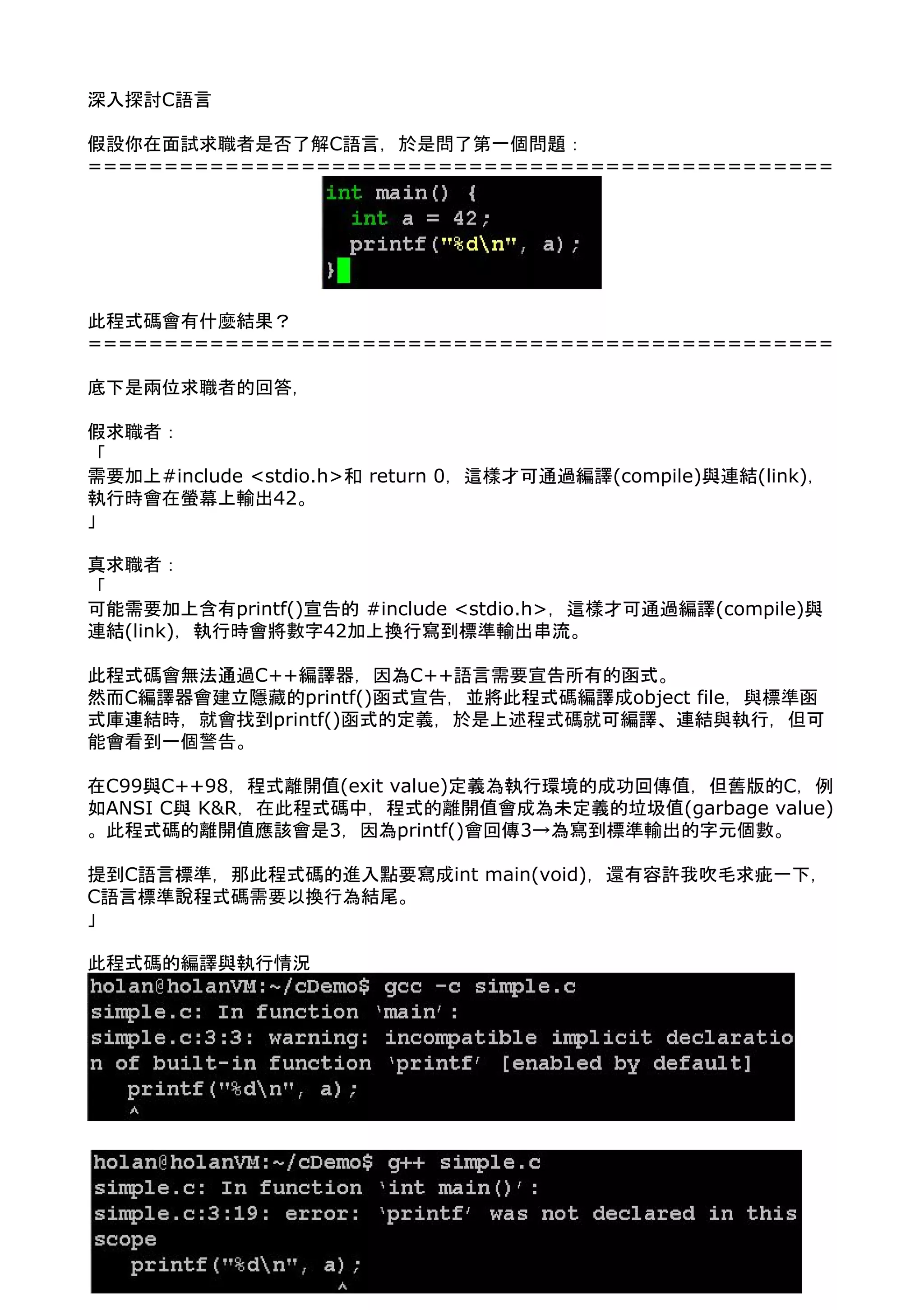 文档探讨了在面试中求职者对C语言知识的回答,通过对比假求职者和真求职者的回答,阐述了C语言编译、连接及执行的多个方面,包括变量初始值、函数声明和语言标准。真求职者提供了更详细和准确的技术知识,展现了对C语言底层机制的理解。本文强调了C语言在执行效率上的设计哲学,以及编译器对代码行为的影响,鼓励读者深入学习相关内容。