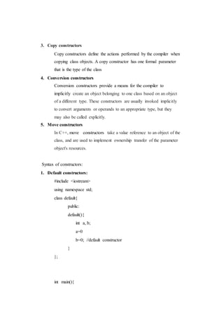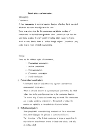 Constructors and destructors play an important role in object-oriented programming. Constructors are special member functions that are called when objects are created. There are different types of constructors including parameterized, default, copy, conversion, and move constructors. Destructors are the inverse of constructors and are called when objects are destroyed. Destructors follow the same name convention as the class but with a tilde. Constructors and destructors are useful in real-time applications such as real-time locating systems and data transmission where they help properly allocate and release resources during an object's lifetime.