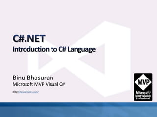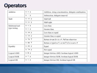 C# is a simple, modern, object-oriented, and type-safe programming language with a unified type system and support for versioning. It supports a variety of statements including blocks, declaration statements, expression statements, selection statements, iteration statements, jump statements, try-catch and try-finally statements, checked and unchecked statements, lock statements, and using statements. Classes are the most fundamental type in C# and combine state in the form of fields with actions in the form of methods and function members. Classes have both static and instance members.