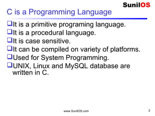 The document provides information about the C programming language. It discusses that C is a procedural language that is case sensitive and can be compiled on various platforms. It also provides examples of C programs, including printing "Hello World", using data types like int and float, and control structures like if-else statements and for loops. The document contains code snippets to demonstrate basic C programming concepts.