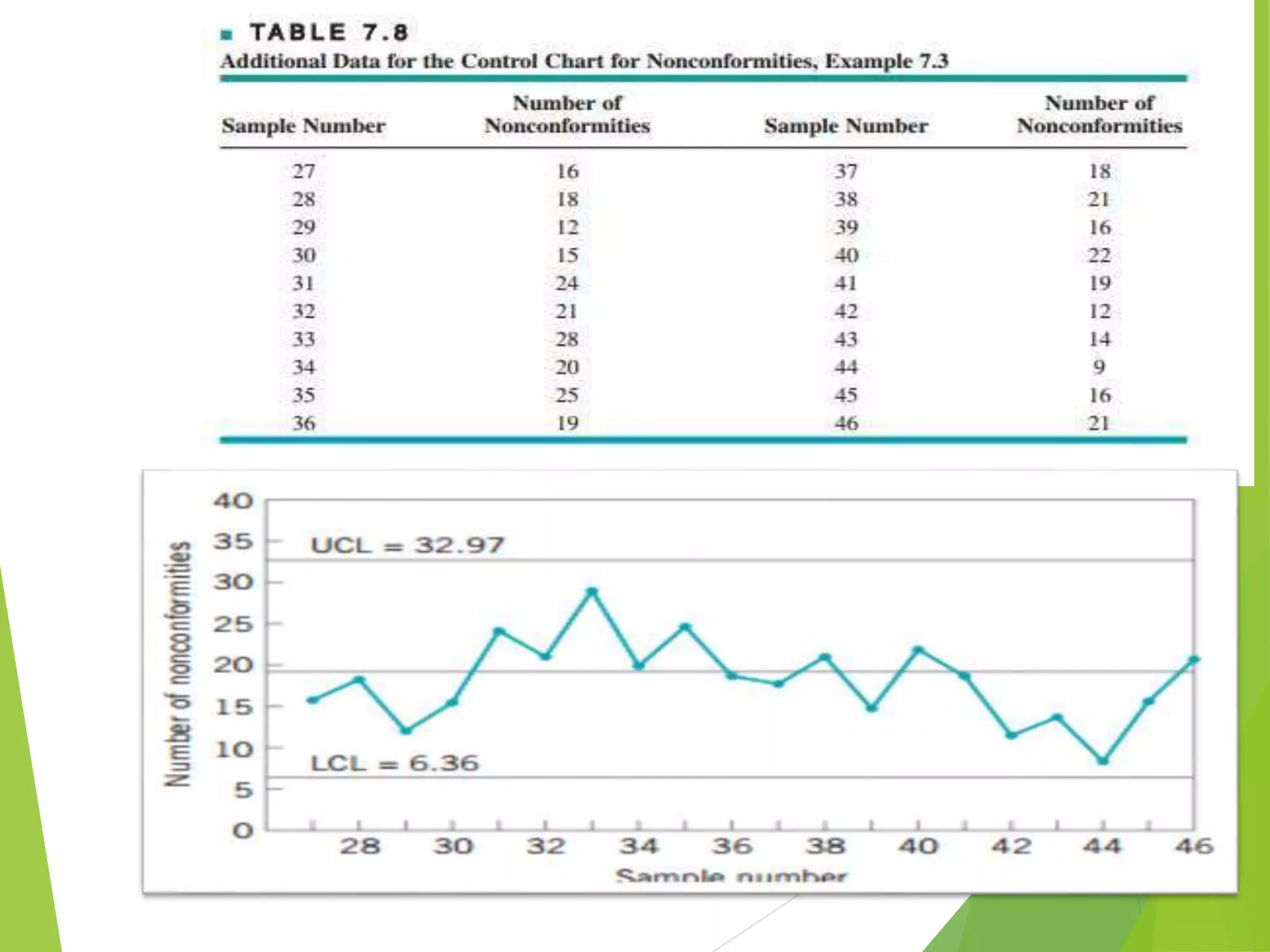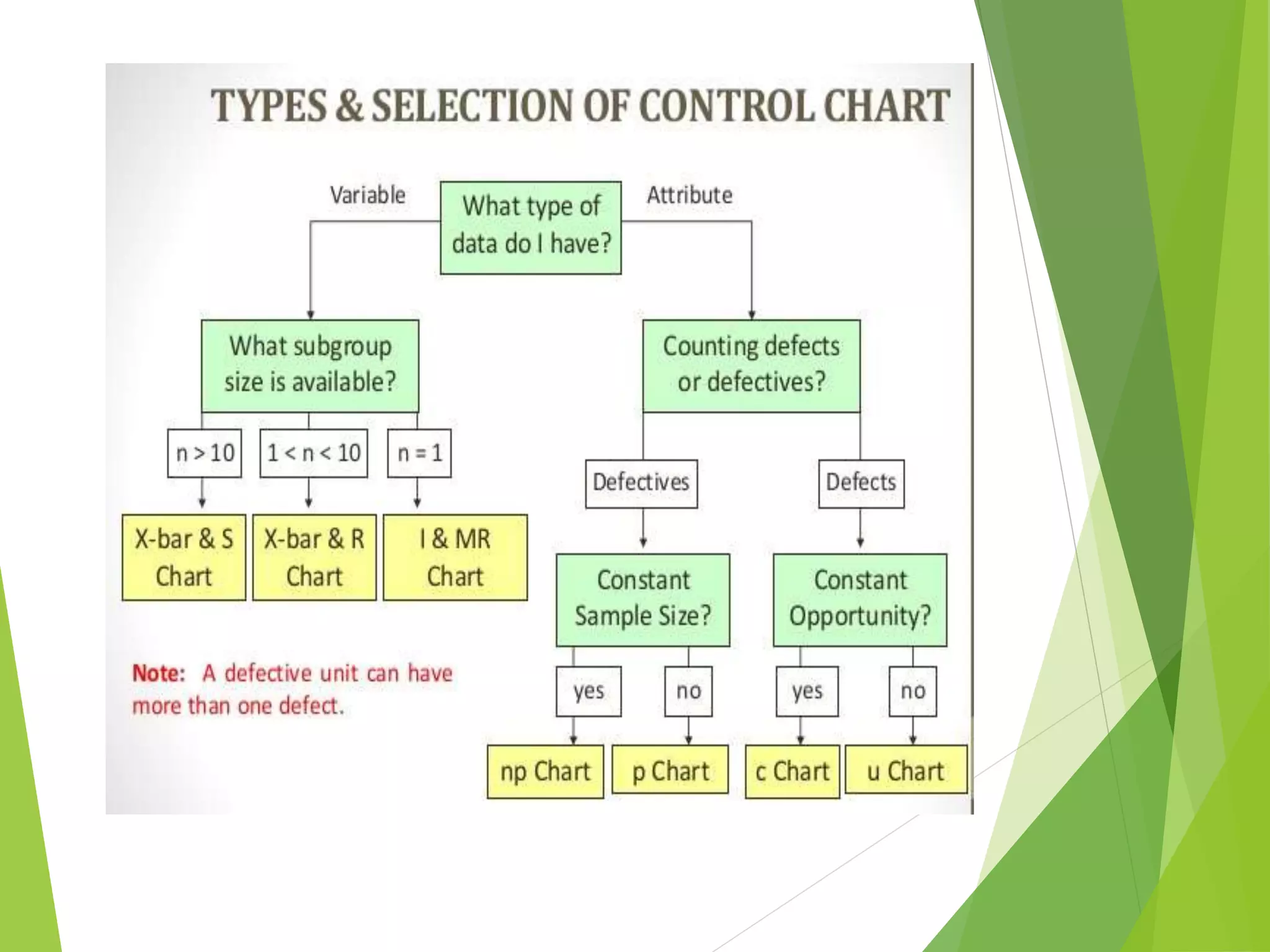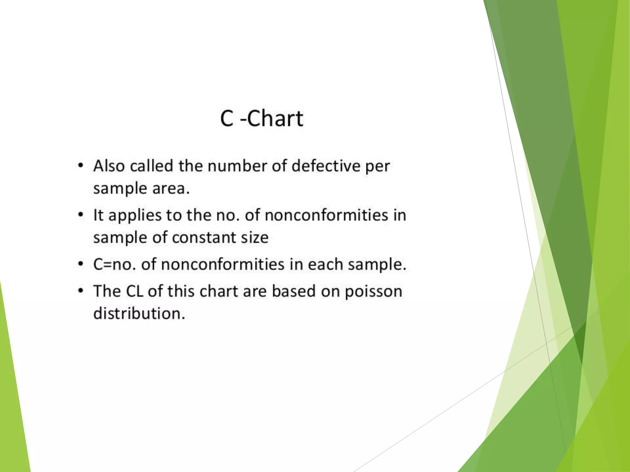 This document discusses C-charts, which are control charts used for nonconformities. C-charts can be used when a standard for nonconformities is given or not given. The chart contains an upper control limit, center line, and lower control limit. C-charts follow a Poisson distribution and are useful for healthcare process improvement and quality control. Examples are provided to demonstrate how to calculate control limits for a C-chart.