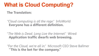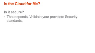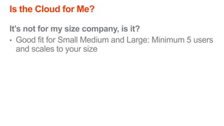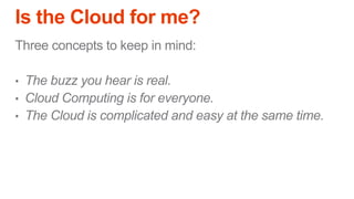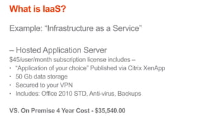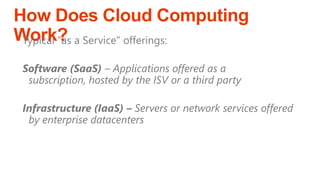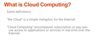 The document outlines a presentation on cloud computing, discussing its definition, functionality, pros and cons, and related concepts such as Software as a Service (SaaS) and Infrastructure as a Service (IaaS). Key advantages include low cost, enterprise infrastructure, and accessibility, while downsides consist of limited customization, dependence on internet access, and potential loss of control. The content aims to help determine if cloud computing is suitable for individual needs.