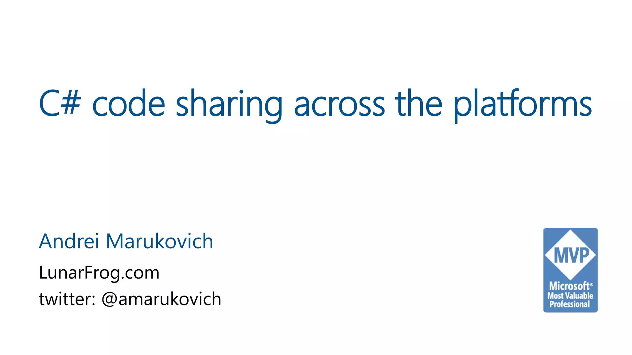 The document discusses various strategies for code sharing across platforms within the .NET ecosystem, highlighting approaches such as shared projects, portable class libraries (PCLs), and .NET Standard. It outlines the benefits and disadvantages of each method, particularly emphasizing the evolution of PCLs into .NET Standard, which defines a set of APIs for compatibility across .NET platforms. The current state of tooling and future developments regarding .NET Standard are also mentioned, indicating a shift towards broader adoption and improved interoperability.