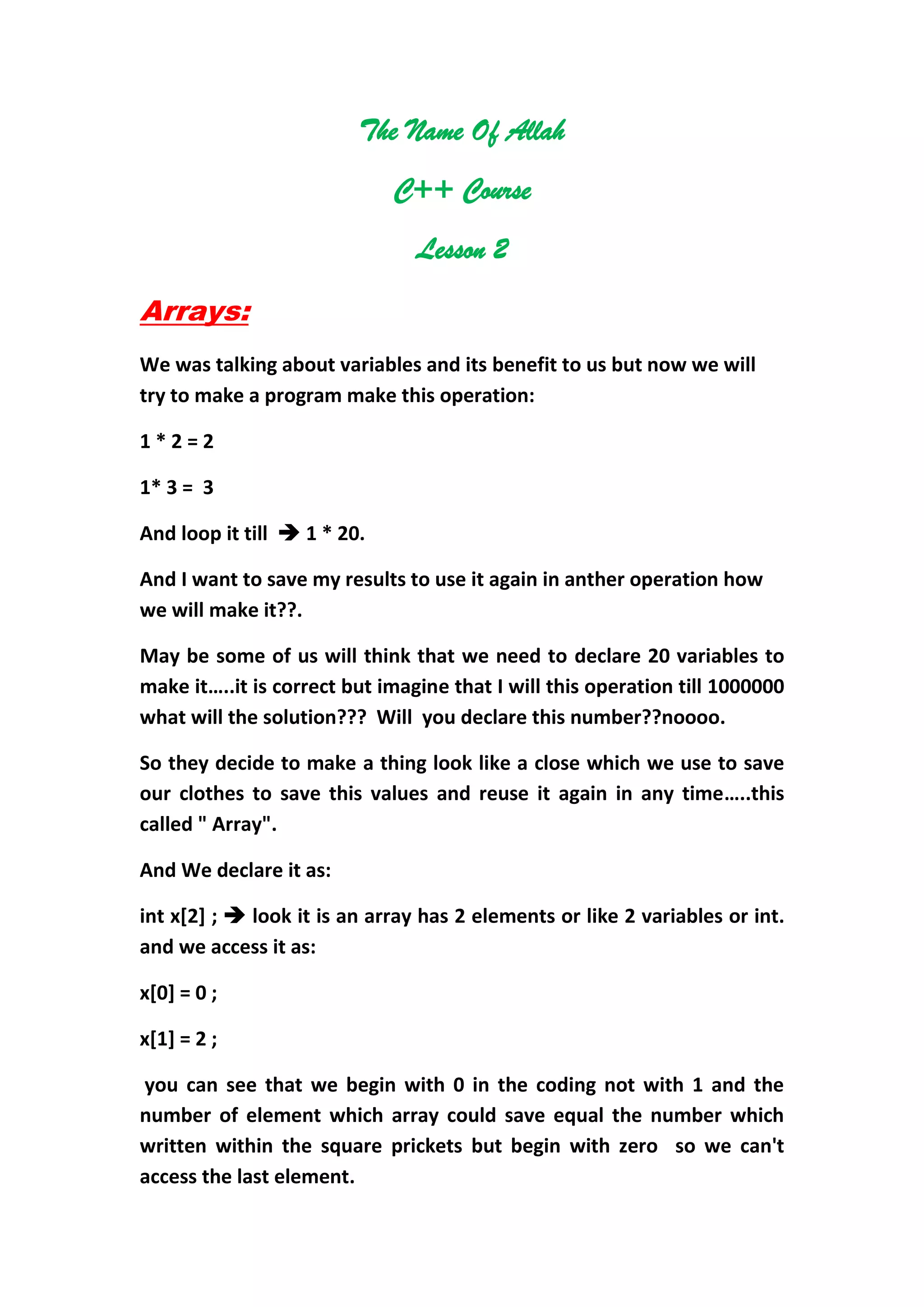 This document discusses arrays and functions in C++. It explains that arrays allow storing multiple values in a single variable to avoid declaring many individual variables. Arrays can store values of different data types like integers, floats, characters. Functions are blocks of code that perform a specific task and can optionally return a value. Functions make code reusable and avoid repetition. The document provides examples of one-dimensional and two-dimensional arrays, and functions with and without parameters. It also assigns practice problems of writing functions to calculate the summation of numbers from 1 to 1000, find the factorial of a given number, and calculate a number to the power of a given exponent.