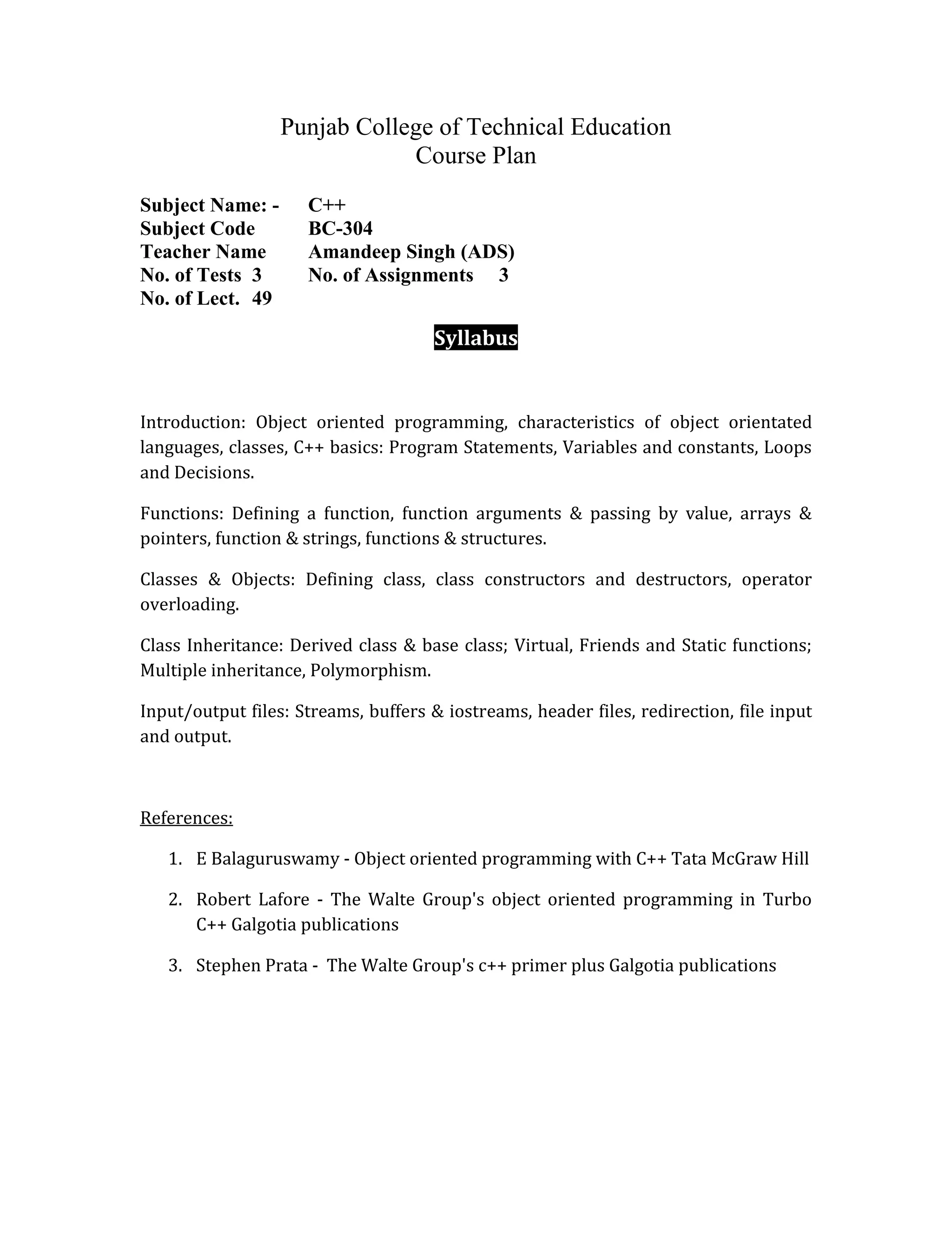 This document outlines the course plan for a C++ course offered at Punjab College of Technical Education. The course will cover topics related to object oriented programming concepts in C++ including classes, inheritance, polymorphism, operator overloading, and file handling. It will include 3 tests, 3 assignments, and 49 lectures over the semester. Attendance of at least 75% is required, and there will be no compensation for missed tests, presentations or assignments. The internal evaluation will be based on a mid-semester exam, presentations, tests, and assignments.