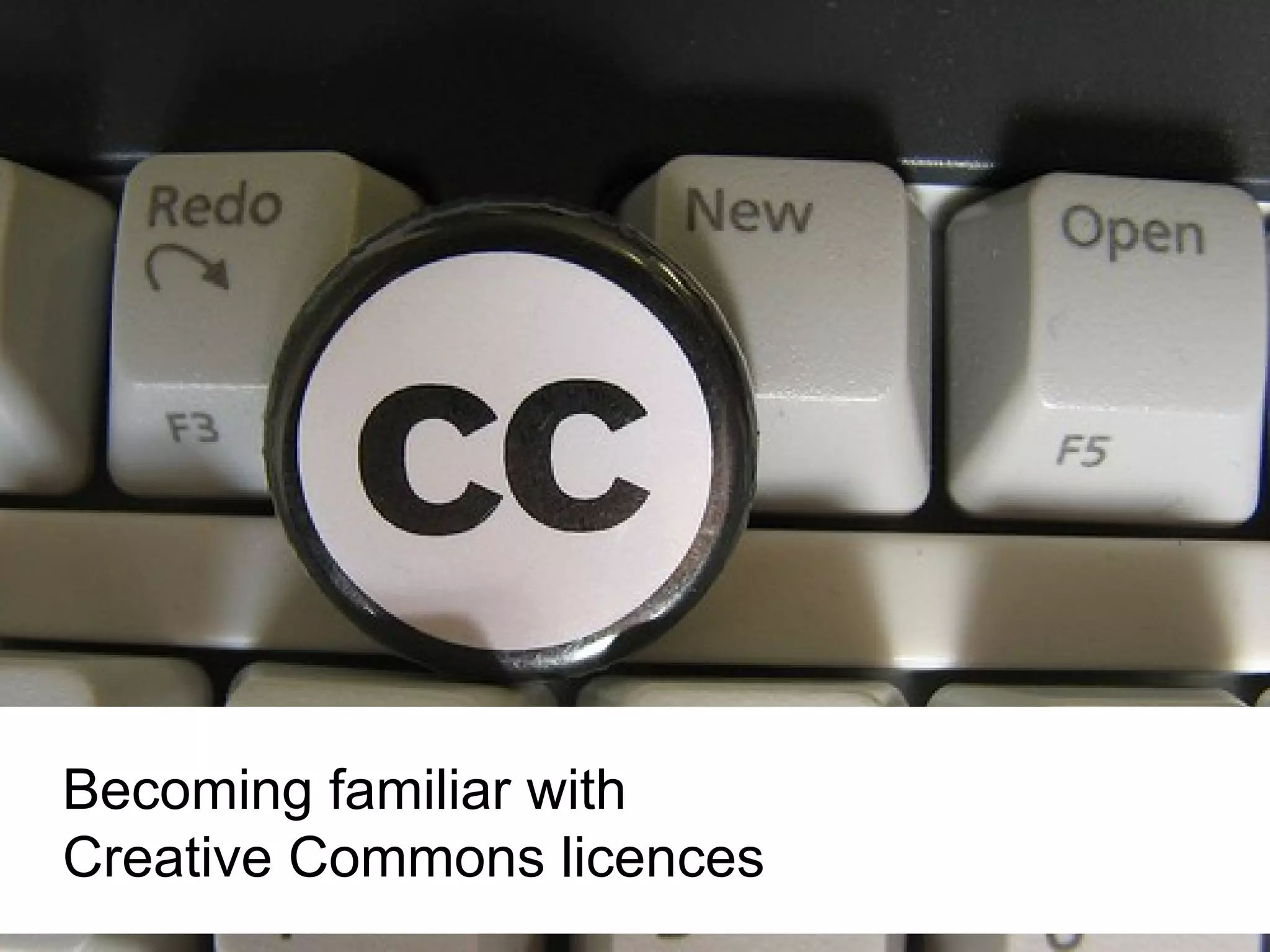 Creative Commons licenses provide alternatives to traditional copyright that allow creators to share their work more freely. There are several Creative Commons licenses that differ based on restrictions around attribution, commercial use, derivatives, and sharing. Creative Commons licenses build upon existing copyright by adding layers of permissions that promote open access, knowledge sharing, and education.