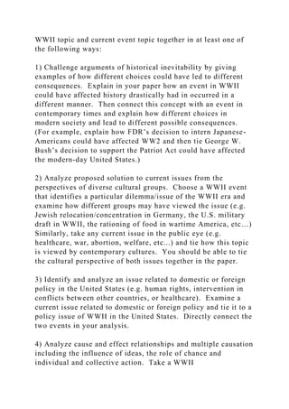 The document outlines an assignment for students to write a current event analysis paper connecting a modern event to a World War II event. The paper must be 4-5 pages, use recognized news sources, and include proper citations and formatting. Students must also create a thesis statement that relates the two events in an analytical manner, avoiding personal pronouns and ensuring originality to prevent plagiarism.