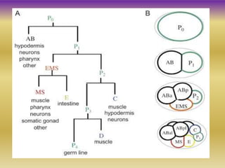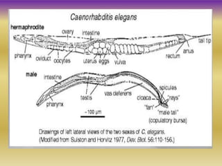 This document summarizes key aspects of the nematode Caenorhabditis elegans. It describes C. elegans' structure as a 1mm long roundworm with 945 cells. It details its life cycle from zygote to adult over 3 days, producing 300 progeny. C. elegans establishes three embryonic axes - anterior-posterior determined by sperm entry point, dorso-ventral set by first cleavage, and left-right by asymmetric cell divisions. The document outlines C. elegans' larval stages and early embryonic development, including axis formation and cell lineage.