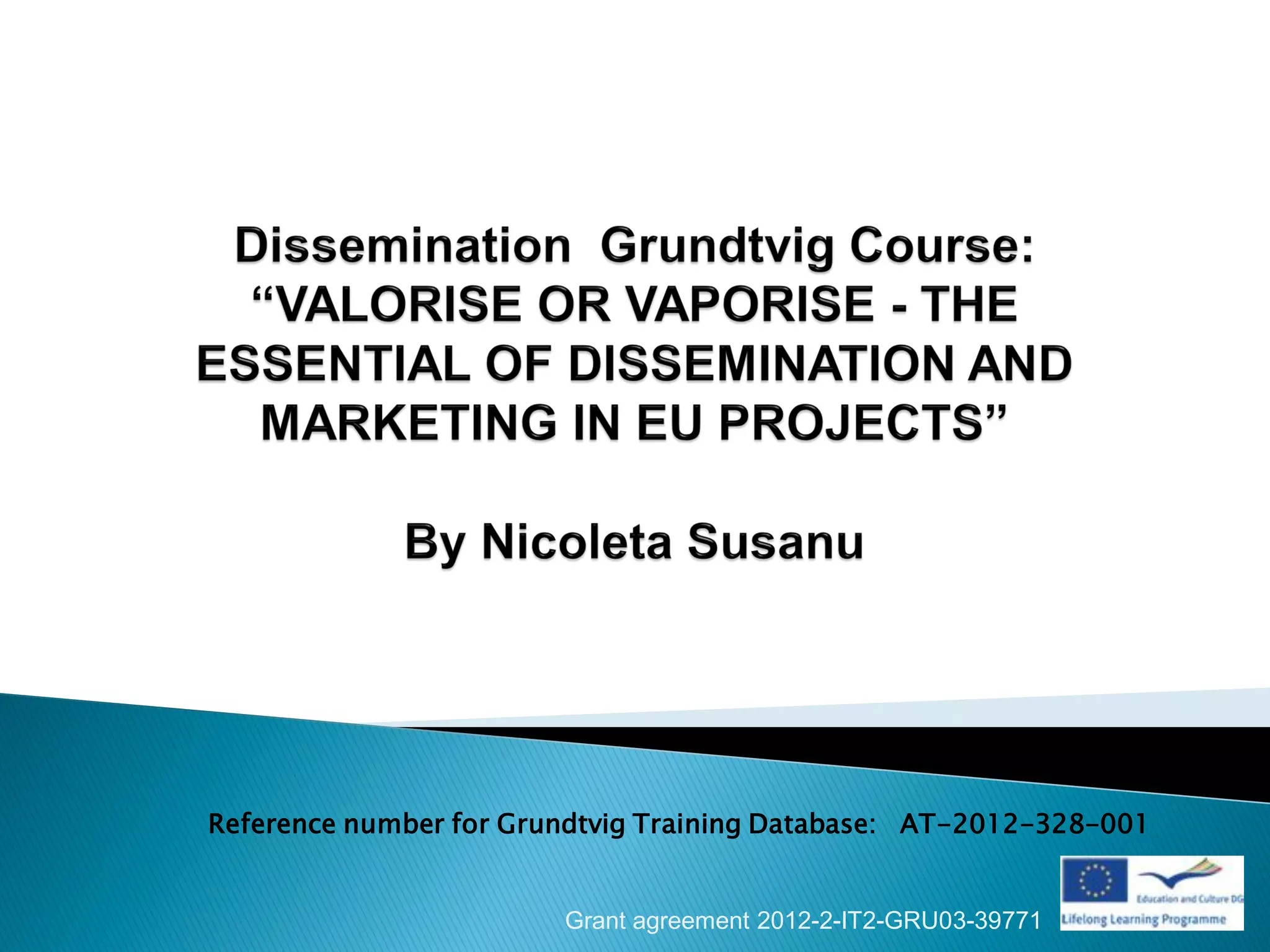 The document discusses an EU Grundtvig program grant agreement. The program aims to provide learning opportunities for adults to improve skills and employability, and help address issues of an aging population. The specific grant agreement funds a training course in Italy to teach marketing and dissemination skills to adult educators. The course involved modules combining theory, group work, guest speakers and field trips to help participants improve dissemination of projects and consider working in European projects. Participants came from several European countries and benefited from improved language skills, new skills and networking opportunities from the intercultural experience.