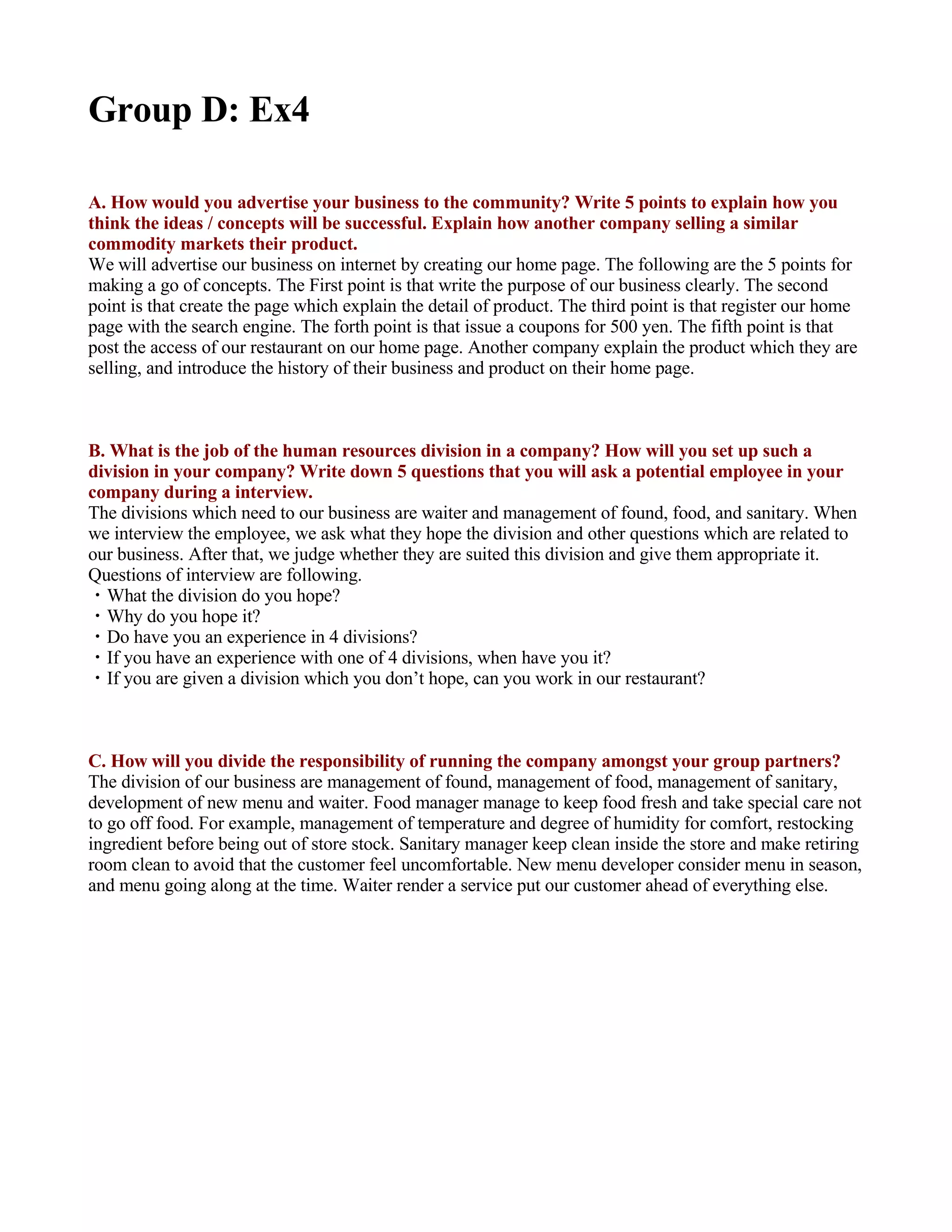 3) Dividing responsibilities among partners for management of finances, food, sanitation, menus, and service.