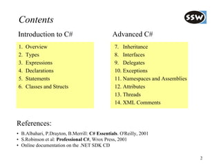 The document provides an introduction and overview of the C# programming language. It covers topics such as types, expressions, declarations, classes, structs, namespaces, assemblies, attributes, threads, and XML comments. It compares C# to languages like Java and C++, and outlines new features in C# like reference and output parameters, objects on the stack, rectangular arrays, and generics. It also provides a basic "Hello World" example and discusses how C# programs are typically structured across multiple files.