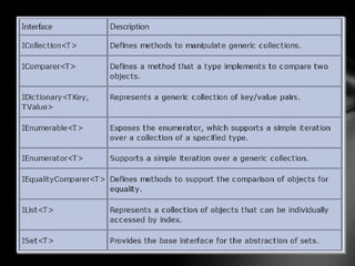 The document discusses generics in C#, explaining that generics allow defining type-safe data structures without committing to actual data types, improving performance and code quality. It covers why generics are required by discussing issues with non-generic stacks, and describes generic type parameters, constraints, methods, delegates and event handling using generics.