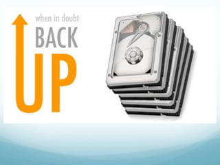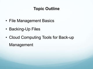 This document discusses file management basics and backing up files. It covers topics such as file structures, naming conventions, compression, and password protecting folders. It emphasizes the importance of regular backups and describes different backup methods and devices, including local backups to external drives or servers and online backups to cloud storage. The document provides instructions for backing up Outlook mail files by copying .pst files to another local or remote location.