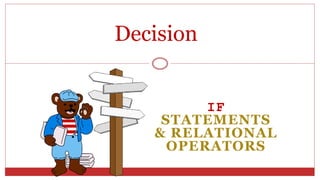 This document discusses if statements, relational operators, and logical operators in C++. It explains if, if-else, and if-else-if statements for one-way, two-way, and multi-way selection. It also covers nested if statements, operator precedence, logical expressions, the boolean type, and examples of using if statements and relational operators to compare values.