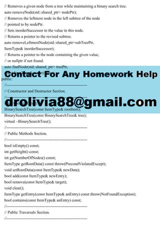 The document provides code for implementing a binary search tree (BST) data structure in C++. It includes the class declaration and functions for inserting nodes, deleting nodes, and traversing the tree using preorder, inorder and postorder traversal. It also includes functions for finding a node, displaying the tree structure, and a main function containing a menu of operations for testing the BST implementation.