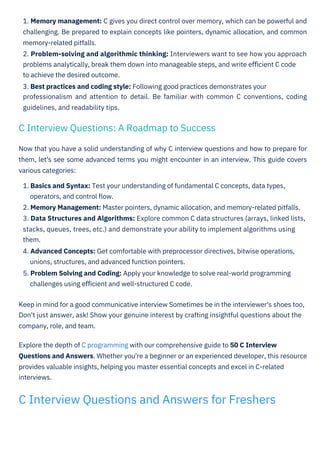 The document is a comprehensive guide on the top 50 C interview questions and answers, aimed at candidates preparing for C programming interviews. It covers essential topics such as memory management, problem-solving skills, data structures, and best coding practices, emphasizing the importance of understanding C concepts. The guide also includes advanced terms, programming techniques, and detailed explanations of critical C features, helping both beginners and experienced developers excel in interviews.