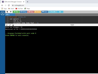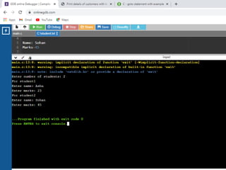 This document contains C code examples for various programming concepts like functions, loops, arrays, structures, pointers etc. There are a total of 40 code snippets showing how to use different features in C like printing output, taking input, if-else conditions, switch case, loops (while, for, do-while), functions (call by value, call by reference), arrays (single, multi-dimensional), structures, pointers etc. Each code snippet is commented and labeled to explain the concept demonstrated in that section.