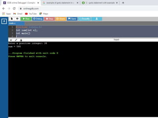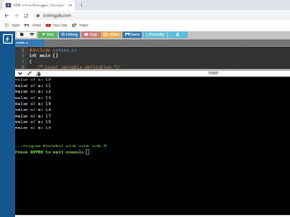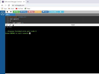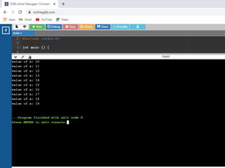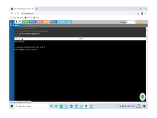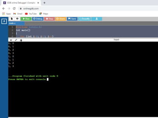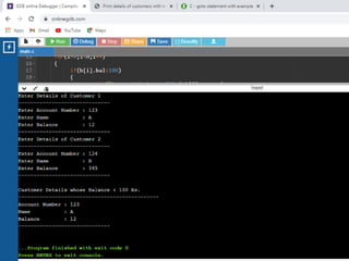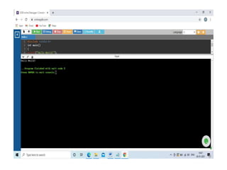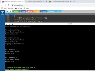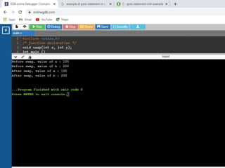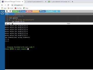 This document contains C code examples for various programming concepts like functions, loops, arrays, structures, pointers etc. There are a total of 40 code snippets showing how to use different features in C like printing output, taking input, if-else conditions, switch case, loops (while, for, do-while), functions (call by value, call by reference), arrays (single, multi-dimensional), structures, pointers etc. Each code snippet is commented and labeled to explain the concept demonstrated in that section.