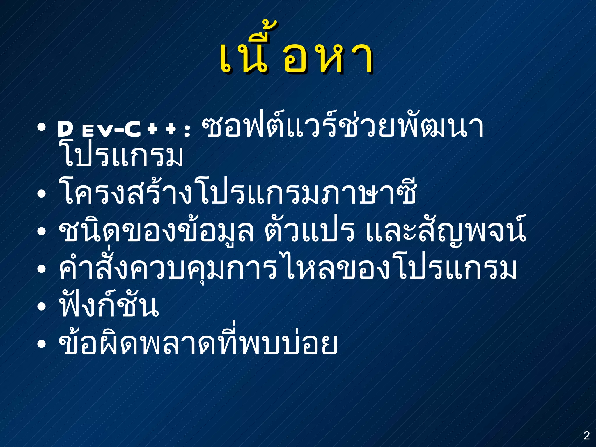 ข้อผิดพลาดที่พบบ่อย #include <stdio.h> int main () { int i; scanf("%d", i); if (i = 0) puts("false"); else puts("true"); return 0; } ส่งค่า i ให้ scanf แทนที่จะส่งตำแหน่ง ใช้คำสั่งกำหนดค่า (=) แทนการเปรียบเทียบ (==)