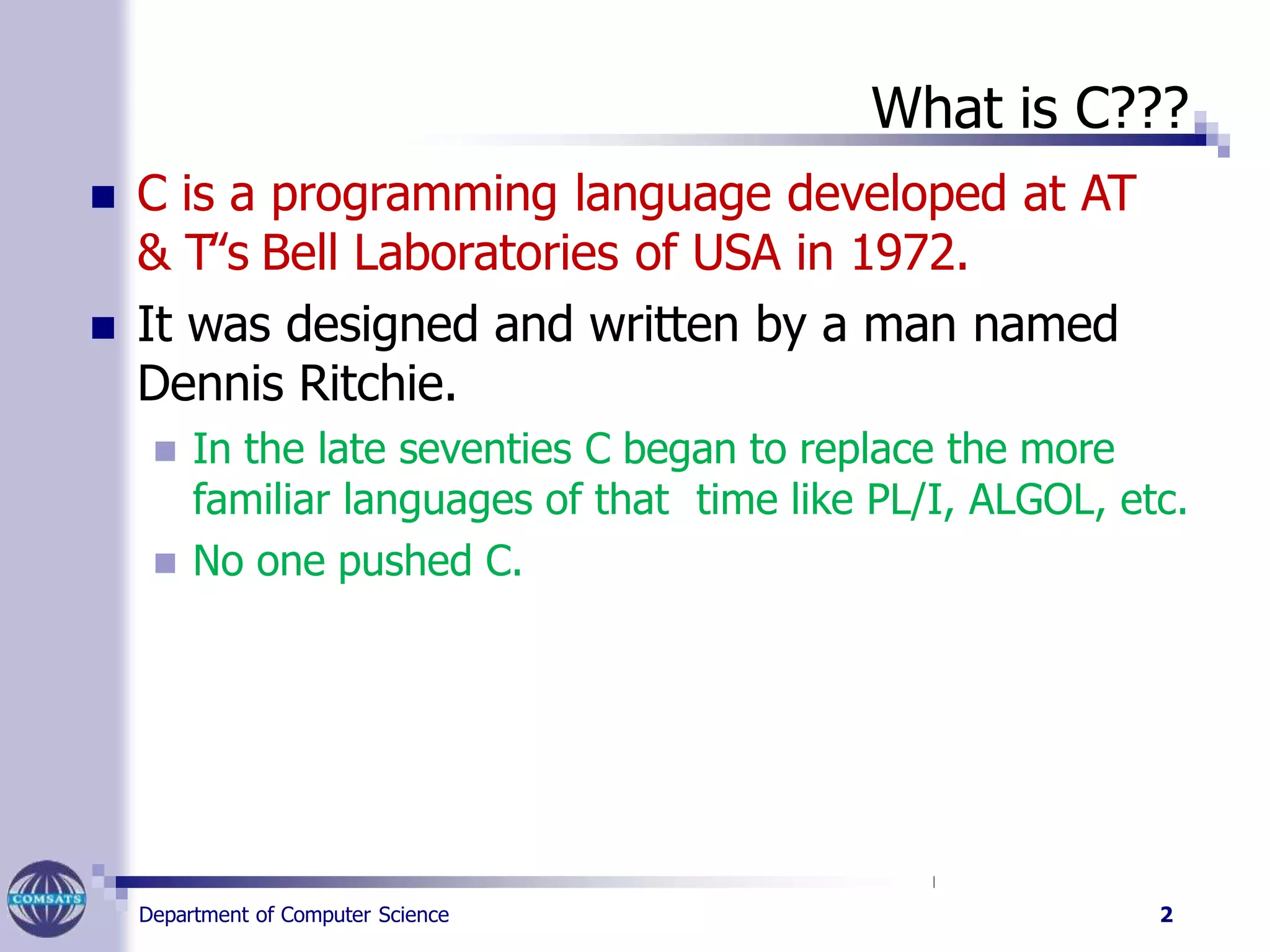 This document provides an introduction to the C programming language. It discusses that C was developed in 1972 and explains some key concepts in C including data types, variables, constants, and functions. It also demonstrates a simple C program to print text and explains how C code is compiled and executed.