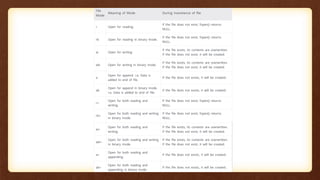 - File operations in C: creating, opening, closing files and reading/writing data. Functions like fopen(), fclose(), fprintf(), fscanf(), fread(), fwrite() are used.