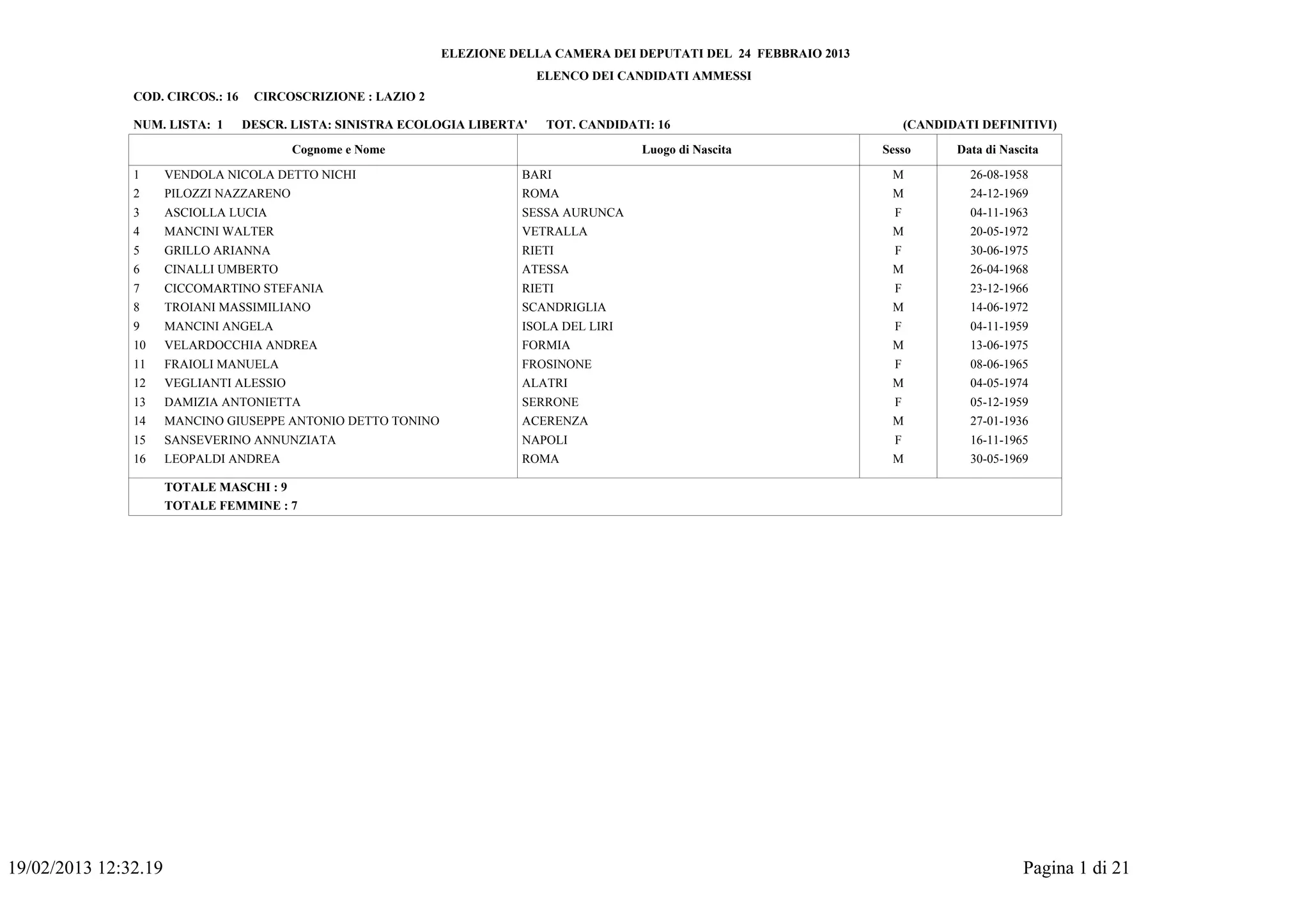 Il documento presenta l'elenco dei candidati ammessi alle elezioni della Camera dei Deputati del 24 febbraio 2013 per la circoscrizione Lazio 2. Sono elencati candidati di diversi partiti, tra cui Sinistra Ecologia Libertà, Partito Democratico e Movimento 5 Stelle, con dettagli su sesso, data e luogo di nascita. Complessivamente, ci sono 166 candidati suddivisi tra maschi e femmine.