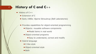 The document provides an overview of the history and basics of C++ programming. It discusses: