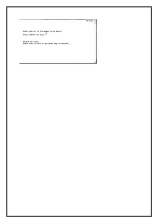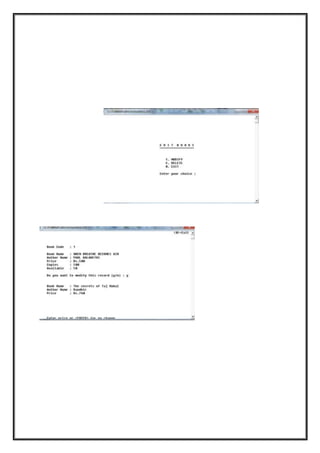 This document describes a library management system project created by Shivani Menon. It includes an introduction outlining the project's objectives and scope, requirements specifications detailing necessary data and software, and descriptions of the services provided to users such as book search, issue, and return functions. The project was developed using C++ due to its advantages for handling large programs through object-oriented principles of modularity, extensibility, and reusability.