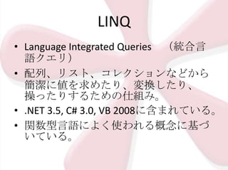 • .NET 3.5, C# 3.0, VB 2008に含まれている。