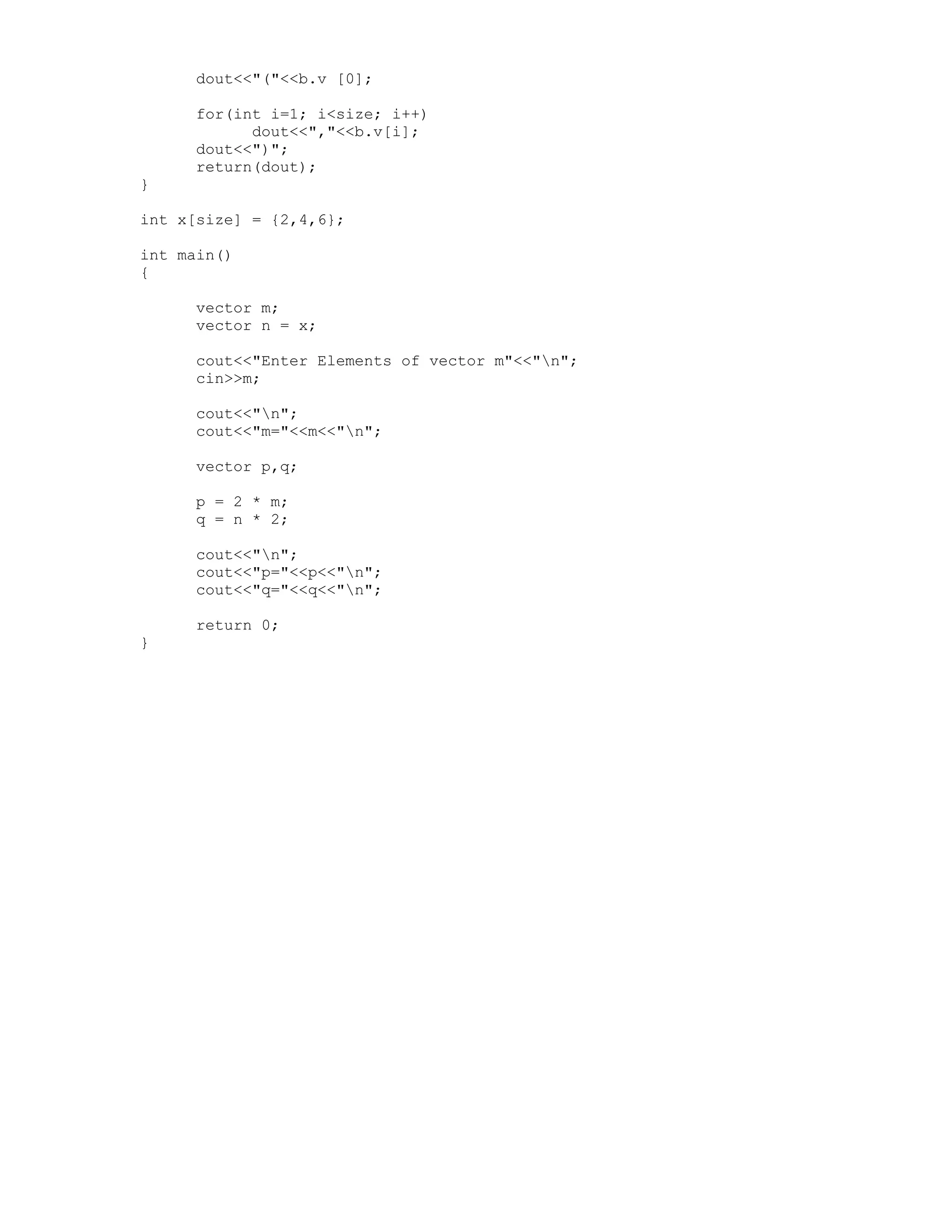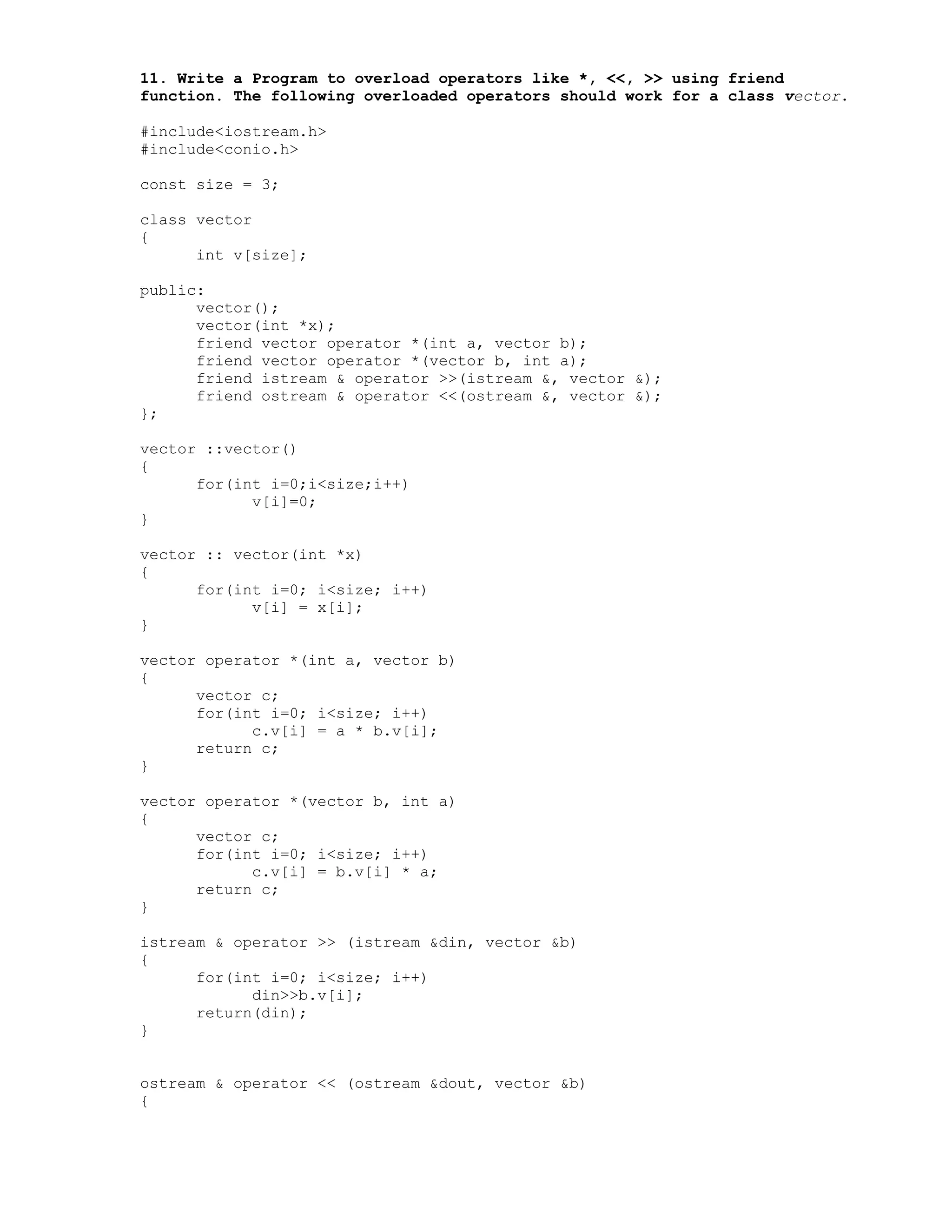 The document contains a series of C++ programming exercises that illustrate various concepts such as operator overloading, matrix operations, memory management, constructors, inheritance, pointer usage, and virtual functions. It provides code snippets for custom classes like vector, matrix, employee, and others, demonstrating specific functionalities such as addition, multiplication, and user-defined memory allocation. Additionally, it emphasizes the understanding of class relationships, initialization order, and the application of polymorphism in programming.