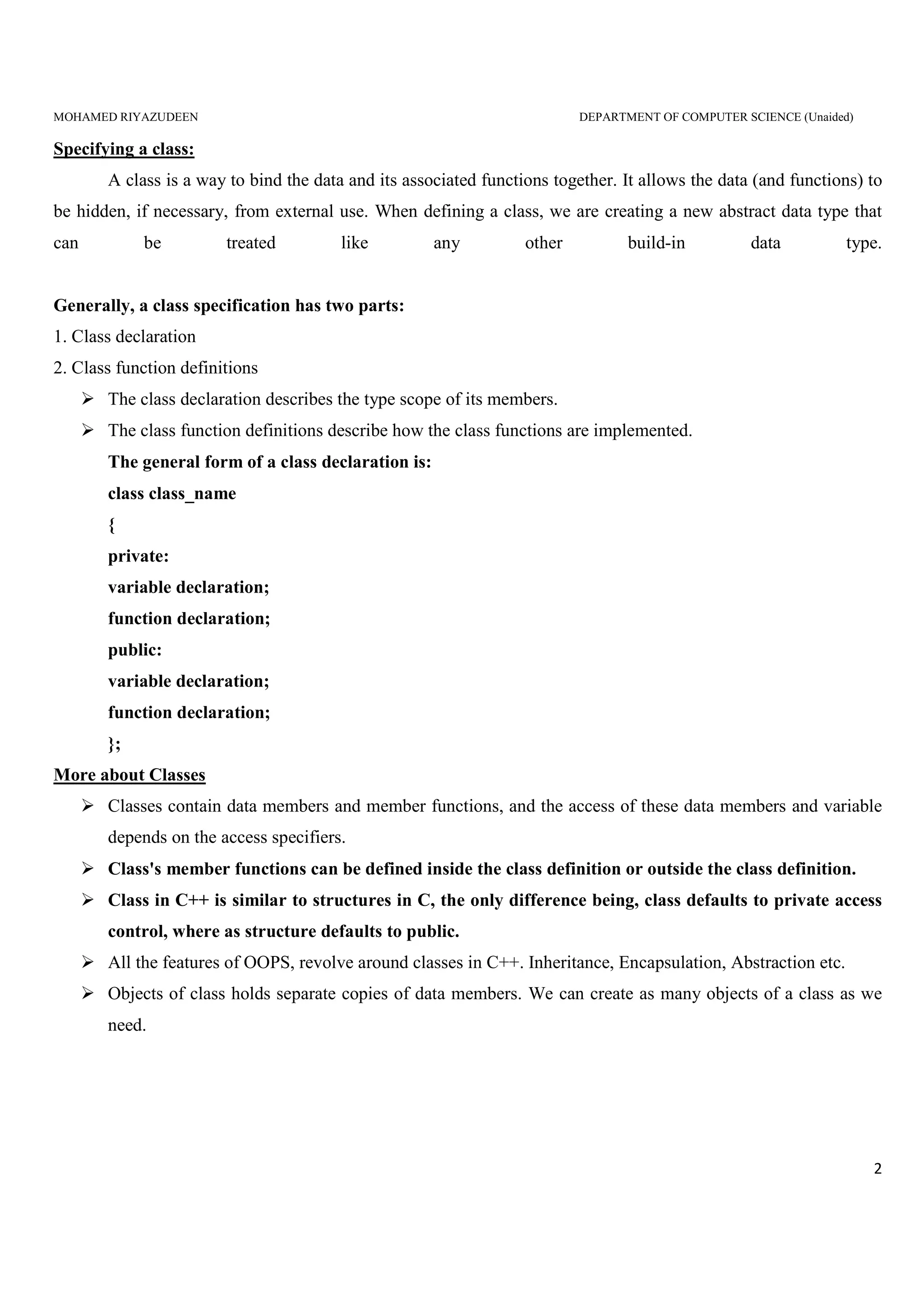 The document discusses structures and classes in C++. It defines a structure called student with data members like name and roll number. It then defines a class called person with data members name and number and demonstrates creating an object of the class and accessing its members. The document also discusses concepts like defining member functions inside and outside classes, access specifiers, nesting member functions, and making outside member functions inline.