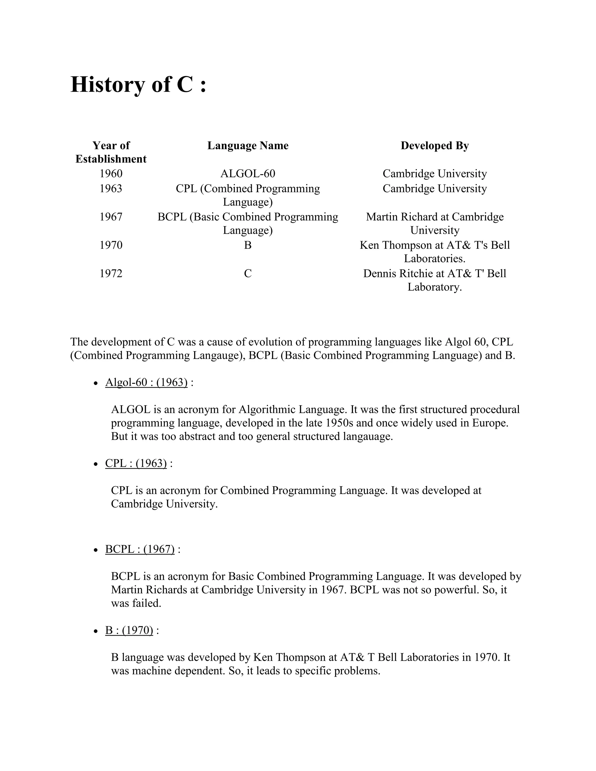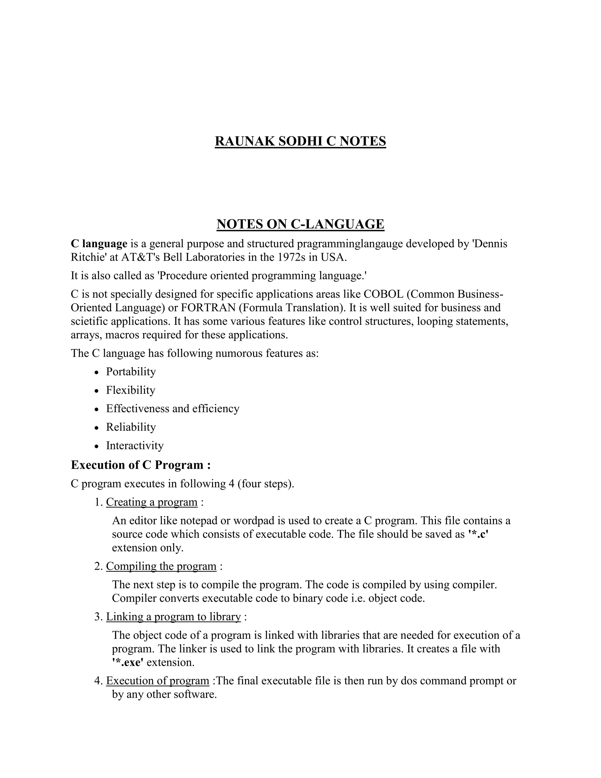 C is a general purpose programming language developed in the 1970s. It has features like control structures, looping statements, and arrays that make it well-suited for business and scientific applications. A C program executes in four steps - creating the program, compiling it, linking it to libraries, and executing the final executable file. C has keywords, variables, data types, operators, and conditional statements that allow for structured programming and control flow.