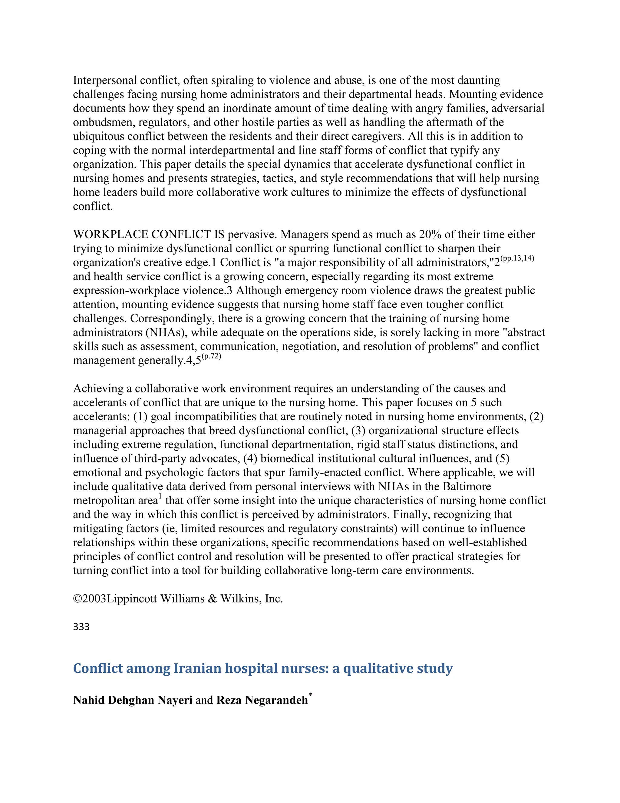 The article explores the sources and experiences of conflict among Iranian hospital nurses through qualitative interviews with 30 nurses and managers. Seven main themes were identified: