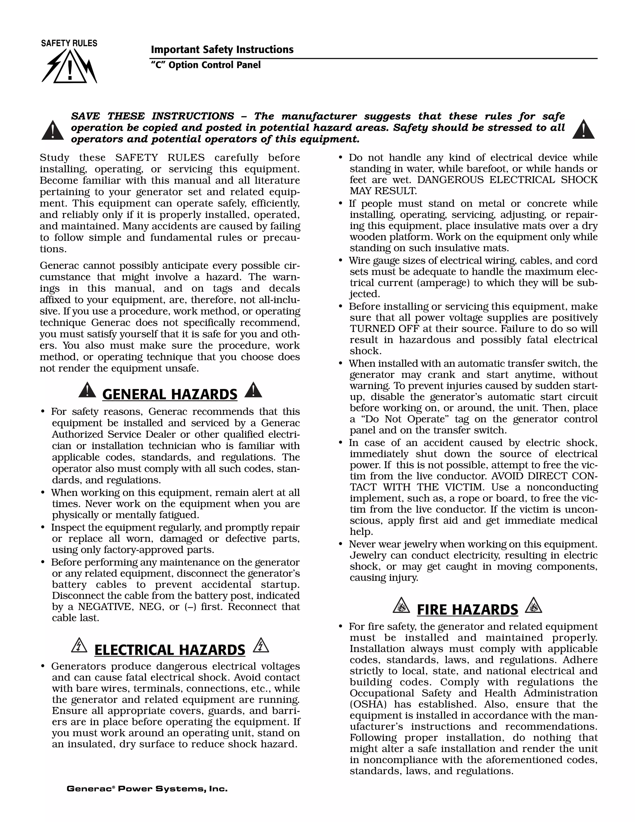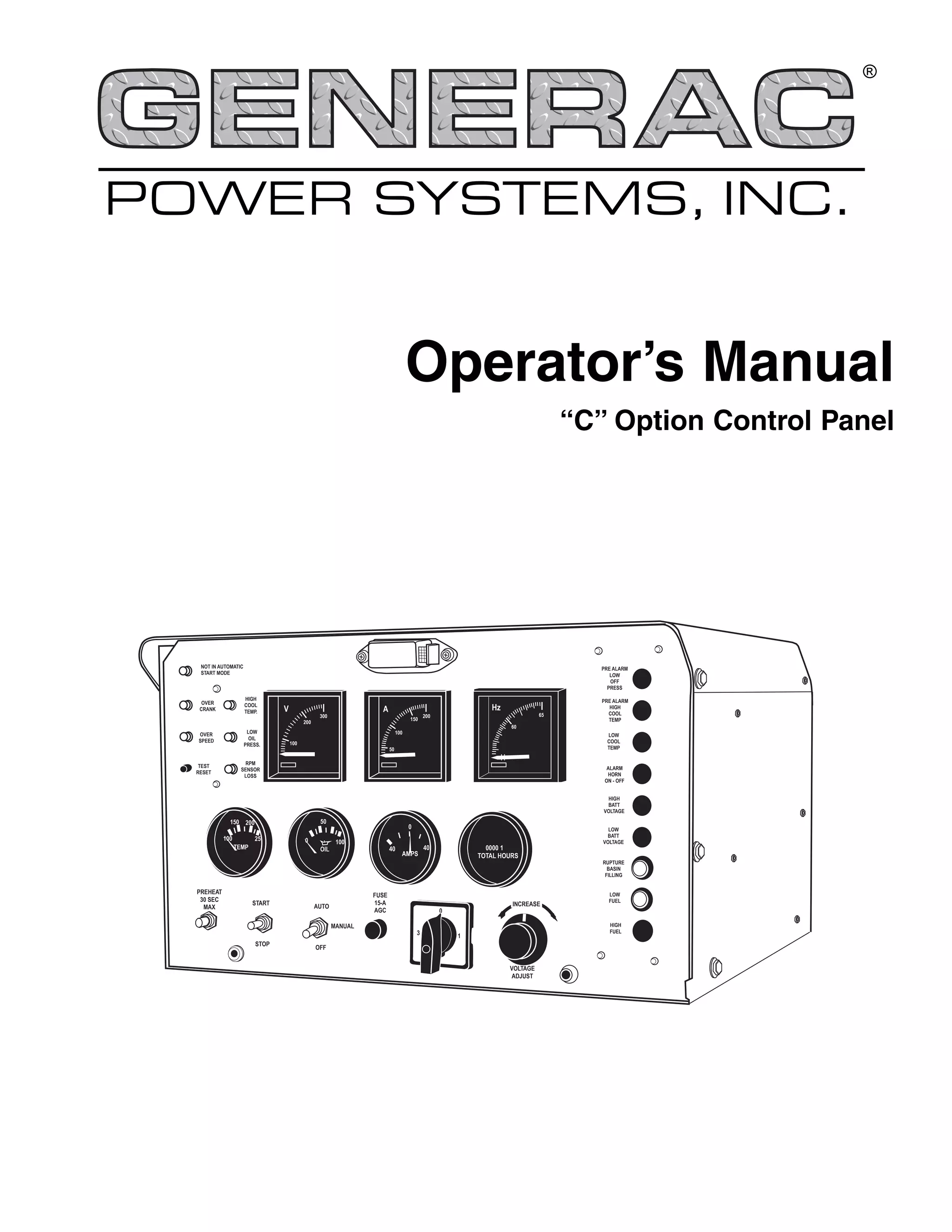 This document provides an overview and instructions for operating the Generac "C" option control panel used on standby generators. The panel includes analog meters and gauges to monitor generator conditions, indicator lamps for fault notifications, and controls for manual or automatic operation. Instructions are provided for startup, shutdown, and monitoring generator parameters during operation. The document also describes optional equipment and covers safety procedures.