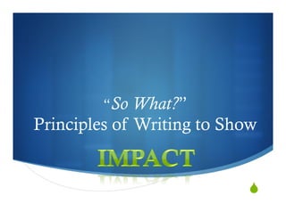 The document outlines principles for impactful writing, emphasizing the importance of audience, purpose, context, and document type. It stresses clarity, organization, and tone, while warning against common pitfalls like over-evidence and grammar mistakes. It provides practical guidelines to enhance communication effectiveness in both school and workplace settings.