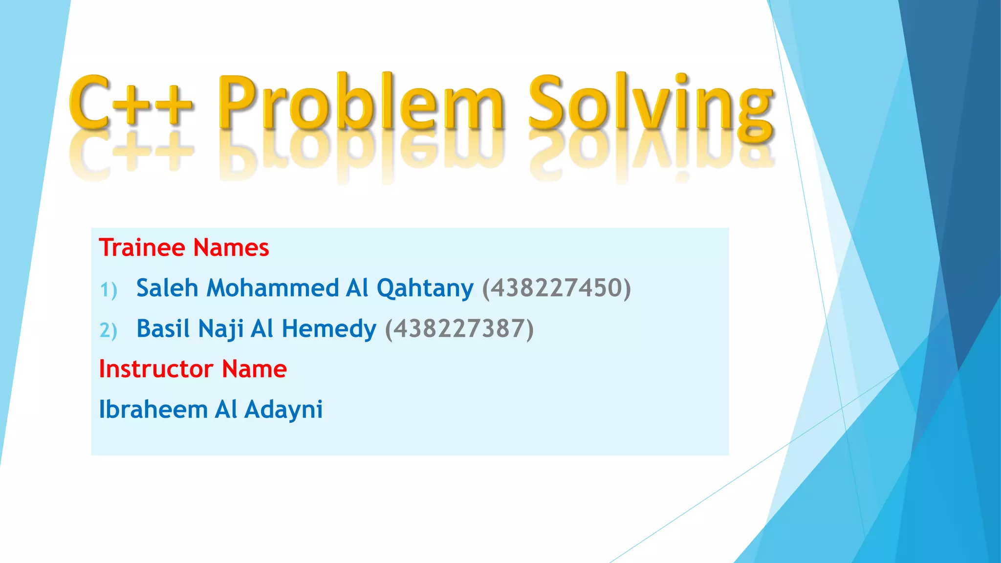 1) This document discusses how to solve problems in C++ by explaining the logical sequence of steps. It outlines the key steps as analyze, flowchart, pseudocode, examples, and references.