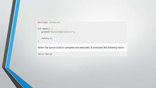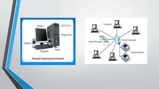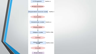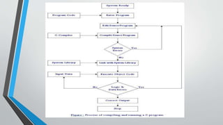 The document provides an introduction to C programming, including algorithms and flowcharts, computer systems and software, and creating and running programs in C. It discusses algorithm development using pseudocode and flowcharts, the components of computer hardware and software, and the process of compiling, linking, and executing C programs. Example algorithms and programs are provided to illustrate various concepts like decision making and iteration. An overview of computing environments like personal, time-sharing, client-server and distributed computing is also presented.