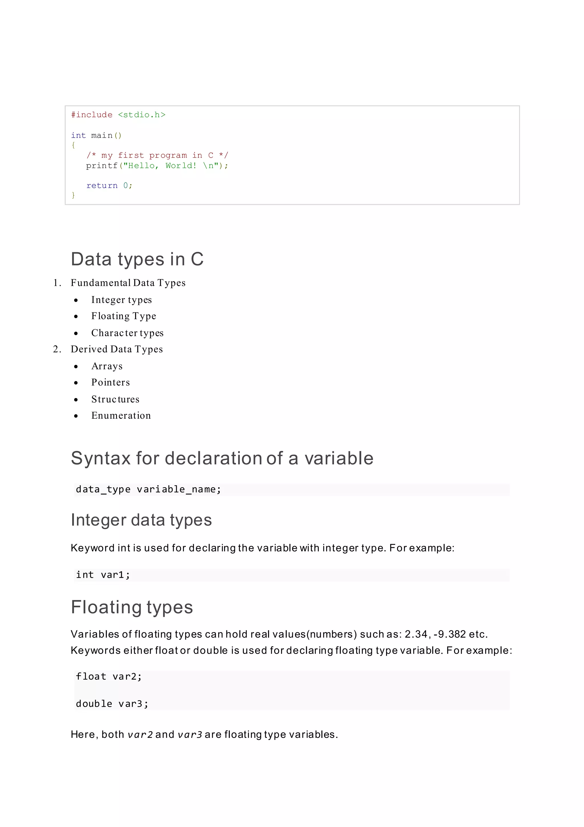 The document discusses various C programming concepts including data types, variables, constants, and input/output functions. It covers fundamental data types like integers, floats, characters, and derived types like arrays, pointers, and structures. It also explains variable declaration syntax, integer and floating point input/output, and arithmetic, relational, logical, and conditional operators.