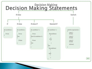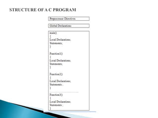 The document provides a comprehensive overview of C programming, covering topics such as programming paradigms, data types, arrays, functions, pointers, structures, preprocessor directives, and file processing. It discusses the significance of C as a middle-level programming language, its portability, efficiency, and its applications in system and embedded programming, as well as its foundational role in the development of other programming languages. Additionally, the text details the compilation process of a C program and the use of standard input/output functions.