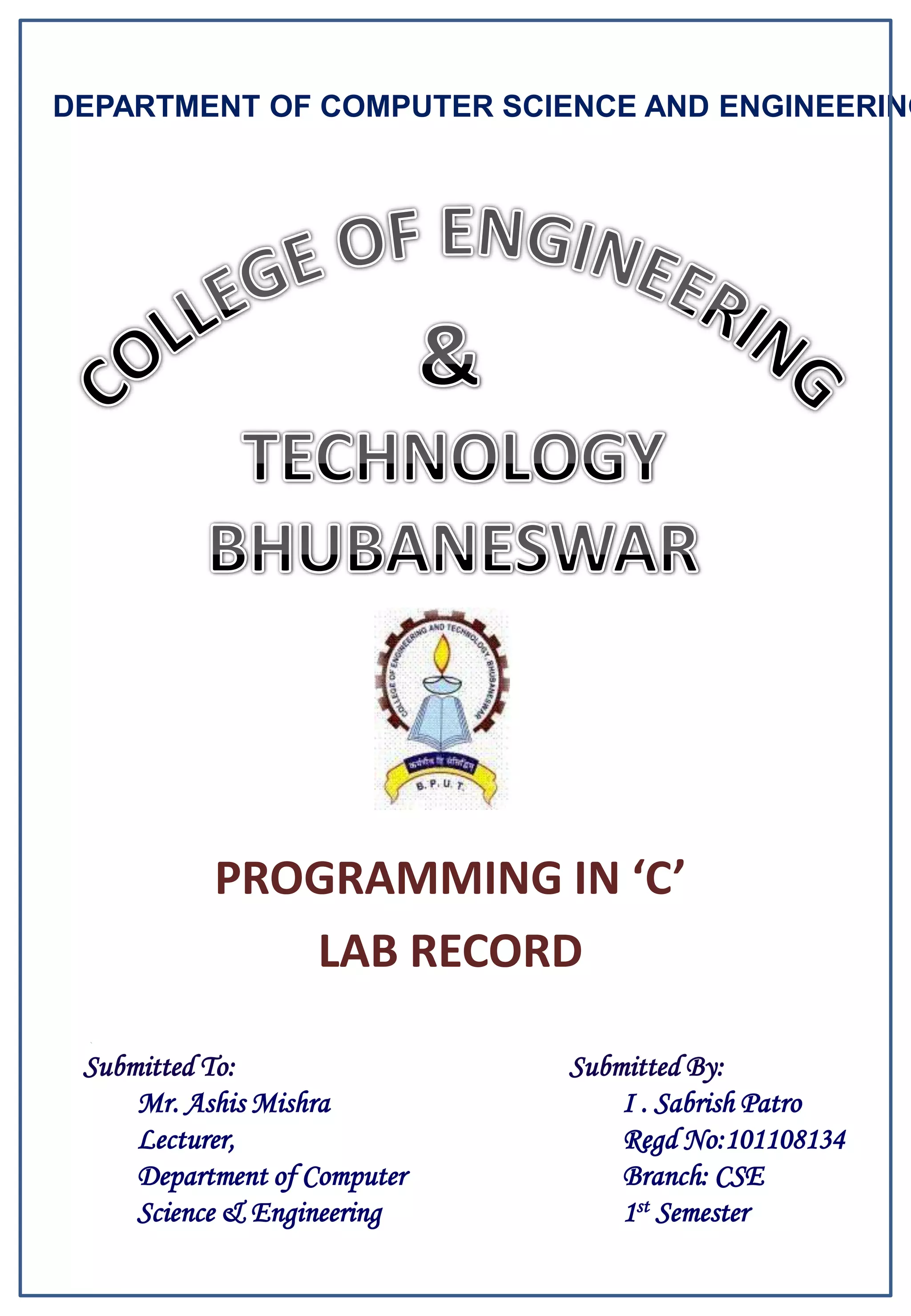The document is a lab record submitted by student Sabrish Patro to lecturer Ashis Mishra for a programming in C course. It details an assignment on programming in C for Sabrish's first semester computer science course.