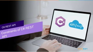 The document provides an overview of REST API, its principles, and how it operates using HTTP methods (verbs) such as POST, GET, PUT, and DELETE, along with HTTP status codes. It highlights constraints specific to C# REST API, including uniform interface, statelessness, client-server separation, cacheability, and layered architecture, which enhance scalability and simplify design. The key takeaway emphasizes that REST API facilitates communication between clients and servers over HTTP, serving as a gateway to access resources.