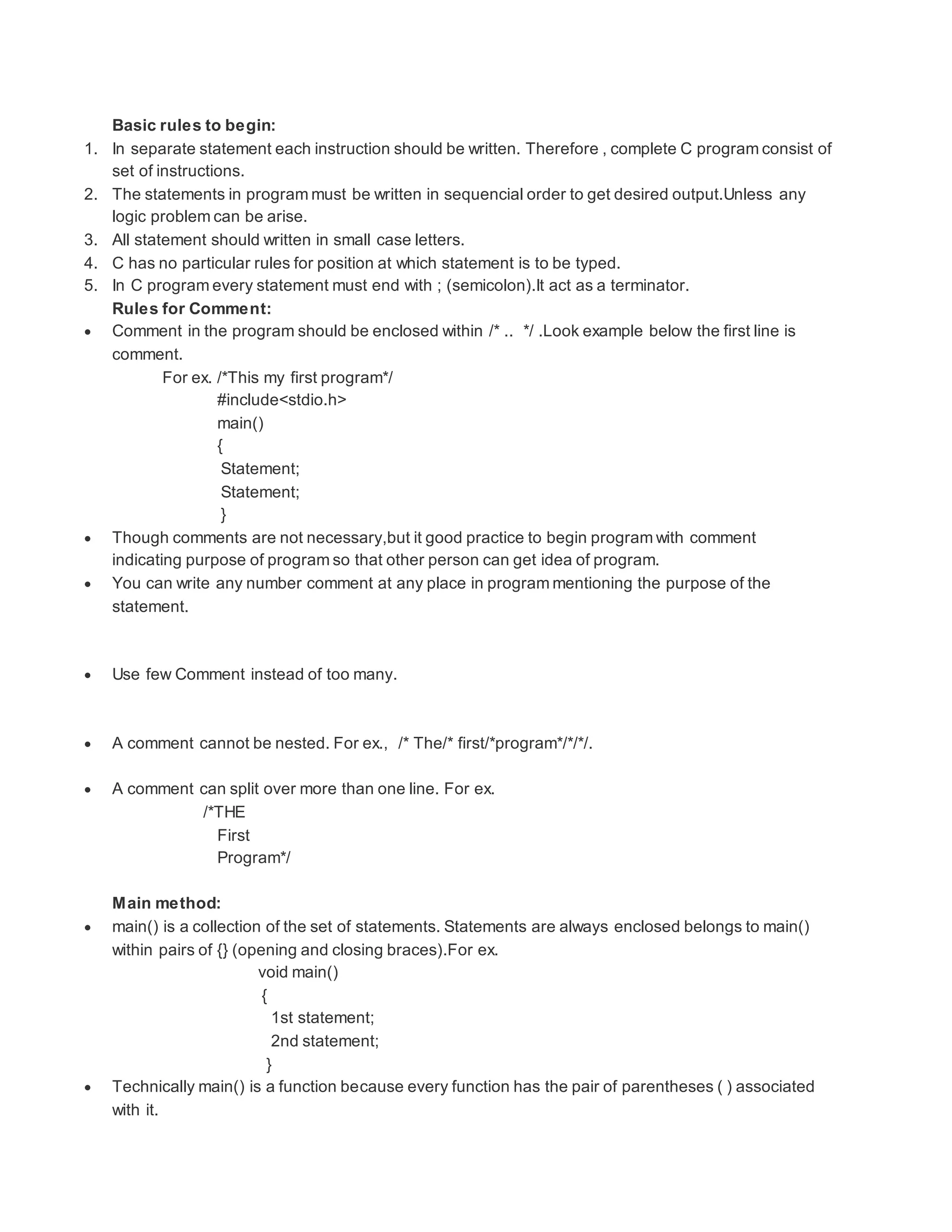 The document provides basic rules and guidelines for writing C programs including: