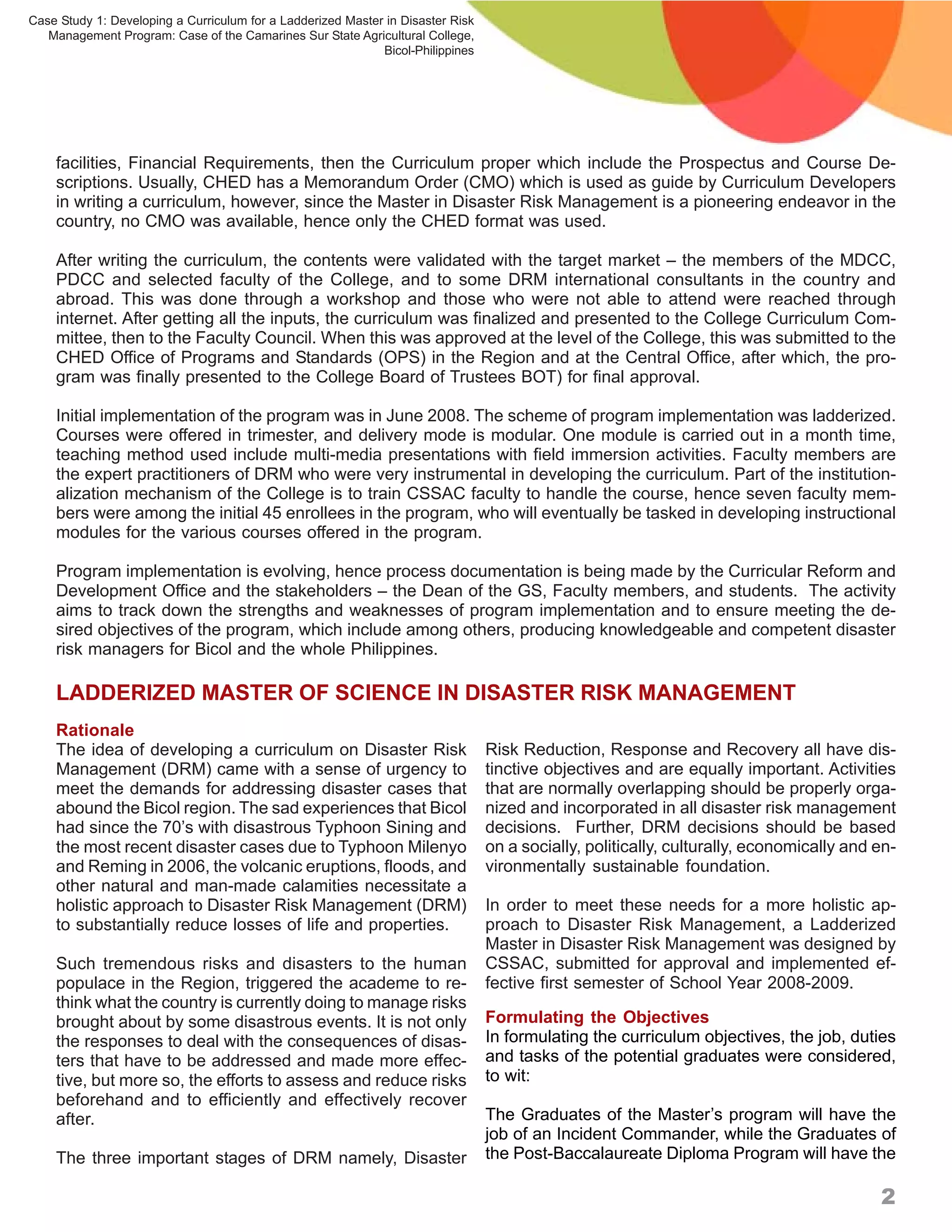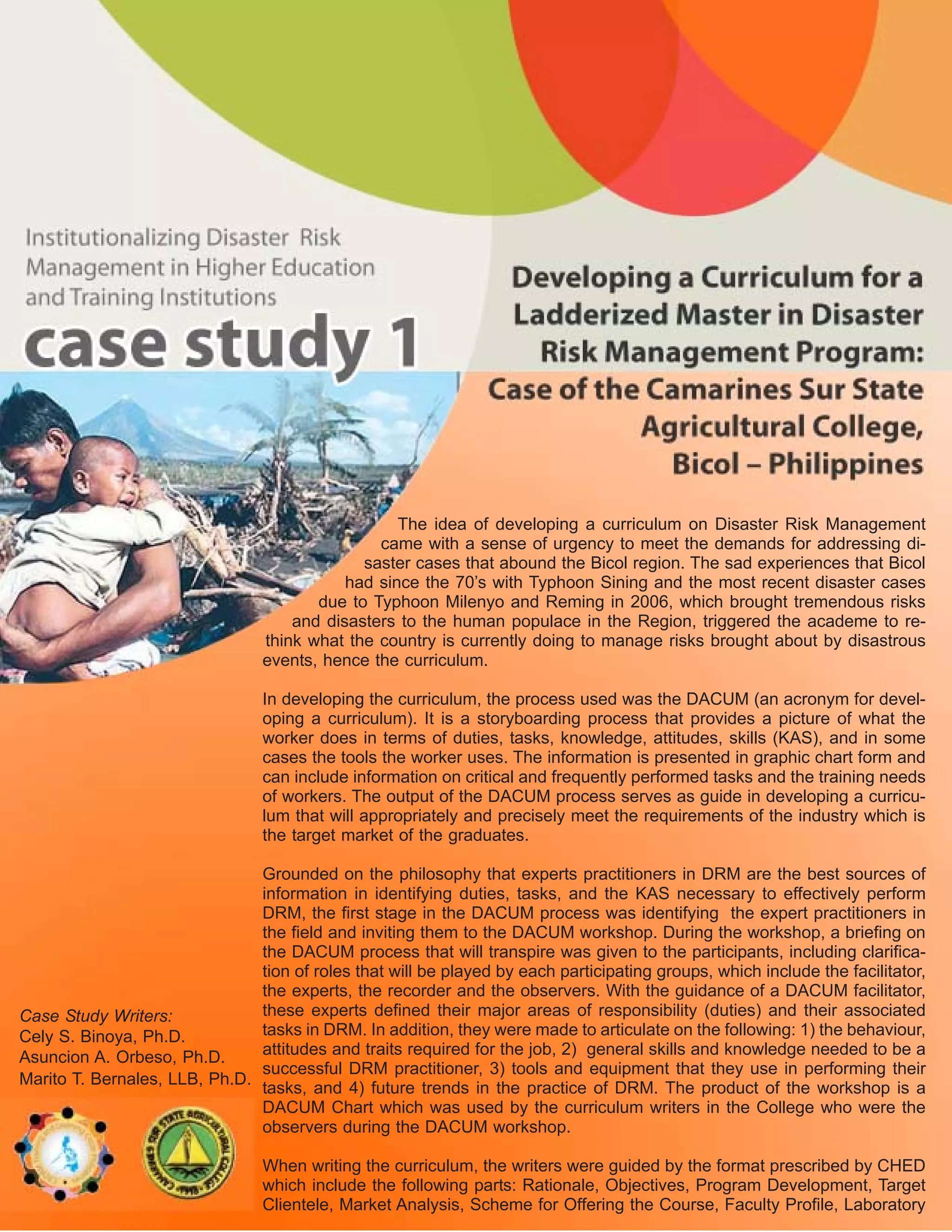 The document describes the process of developing a ladderized Master in Disaster Risk Management program at the Camarines Sur State Agricultural College in Bicol, Philippines. It involved conducting a DACUM workshop with disaster risk management experts to identify the key duties, tasks, and skills needed for the program. The results were used to develop the curriculum, which was then validated with stakeholders before gaining approvals. The program aims to train professionals to work in disaster risk reduction, response, and recovery. It targets government officials and other professionals involved in disaster management.