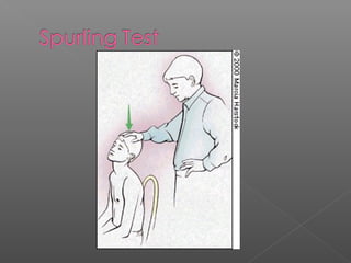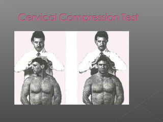 This document discusses cervical spine anatomy, injuries, and evaluation. It outlines the ligaments of the cervical spine, dermatomes, myotomes, and common mechanisms of injury. It provides details on evaluating range of motion, neurological function, and special tests like Spurling's test and brachial plexus traction test to assess for cervical injuries. Treatment options depend on the specific vertebrae and type of fracture, ranging from bracing to surgery.