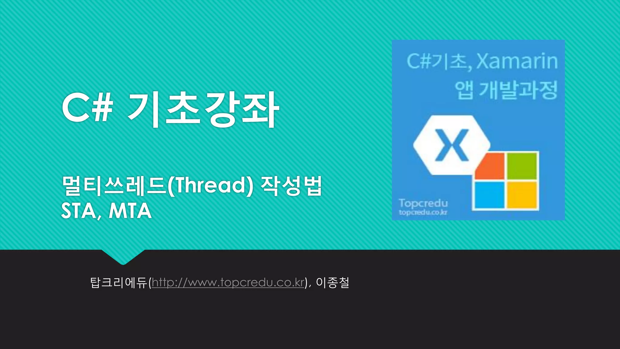 탑크리에듀(http://www.topcredu.co.kr),오라클자바커뮤니티(http://ojc.asia)에서 제공하는 초보자를 위한 닷넷, C# 기초강좌 입니다. 이번강좌에서는 쓰레드에 대해 간단히 살펴보고 C#에서 멀티 쓰레드로 프로그래밍 하는 방법을 실습하는 강좌입니다.