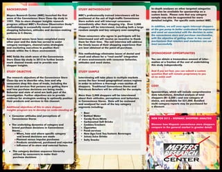 Meyers Research Center is a leading retail research organization that conducts in-store intercept surveys of convenience store shoppers to understand their behaviors, attitudes, and purchasing decisions. For over 30 years, MRC has surveyed over 2,000 shoppers per wave across the US and Canada on topics like category selection, brand preferences, and factors influencing purchases. The ninth wave of the Convenience Store Close-Up study will take place in 2012, with sponsorship opportunities available to commission customized analyses for a fee.