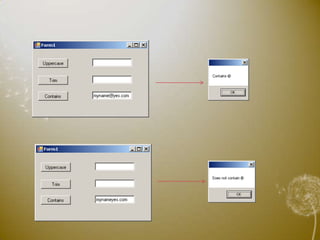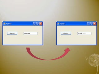 This document discusses C# .NET strings and various methods that can be used on string variables including trim, contains, replace, and substring. Trim removes unwanted characters from the start and end of a string. Contains checks if a substring is within a string. Replace replaces occurrences of one substring with another. Substring extracts a portion of a string starting from a specified index for a given length.