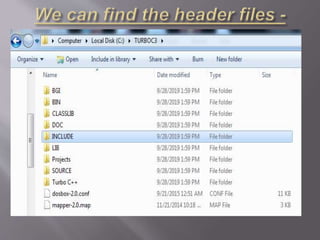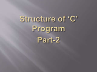 The document outlines the structure and components of a 'C' program, highlighting the role of functions, comments, and preprocessor directives. It discusses the importance of standard and console input/output header files, and provides examples of basic functions like printf() and scanf(). Additionally, it explains the use of local variables, library functions, and user-defined functions, as well as the character set used in 'C' programming.