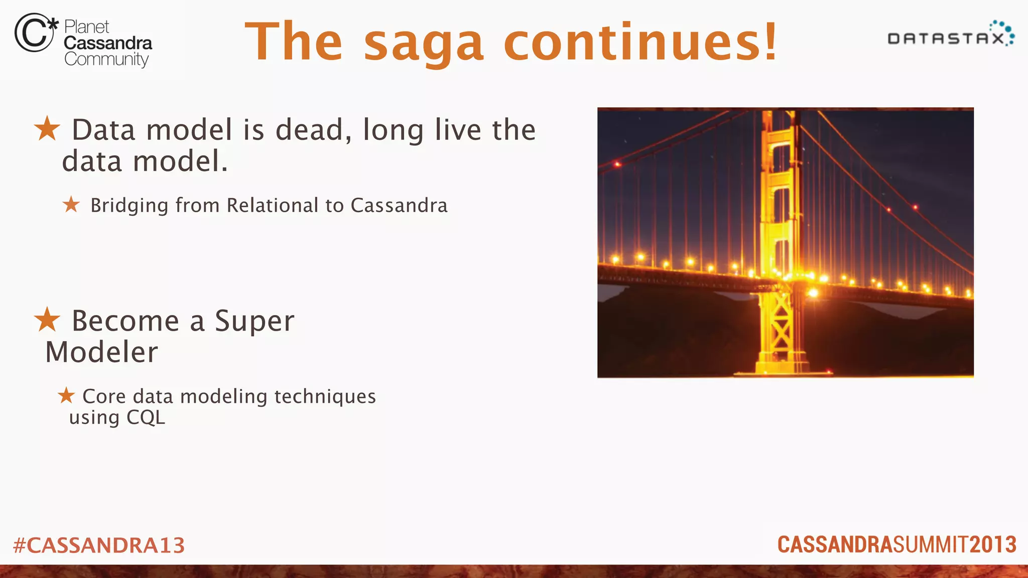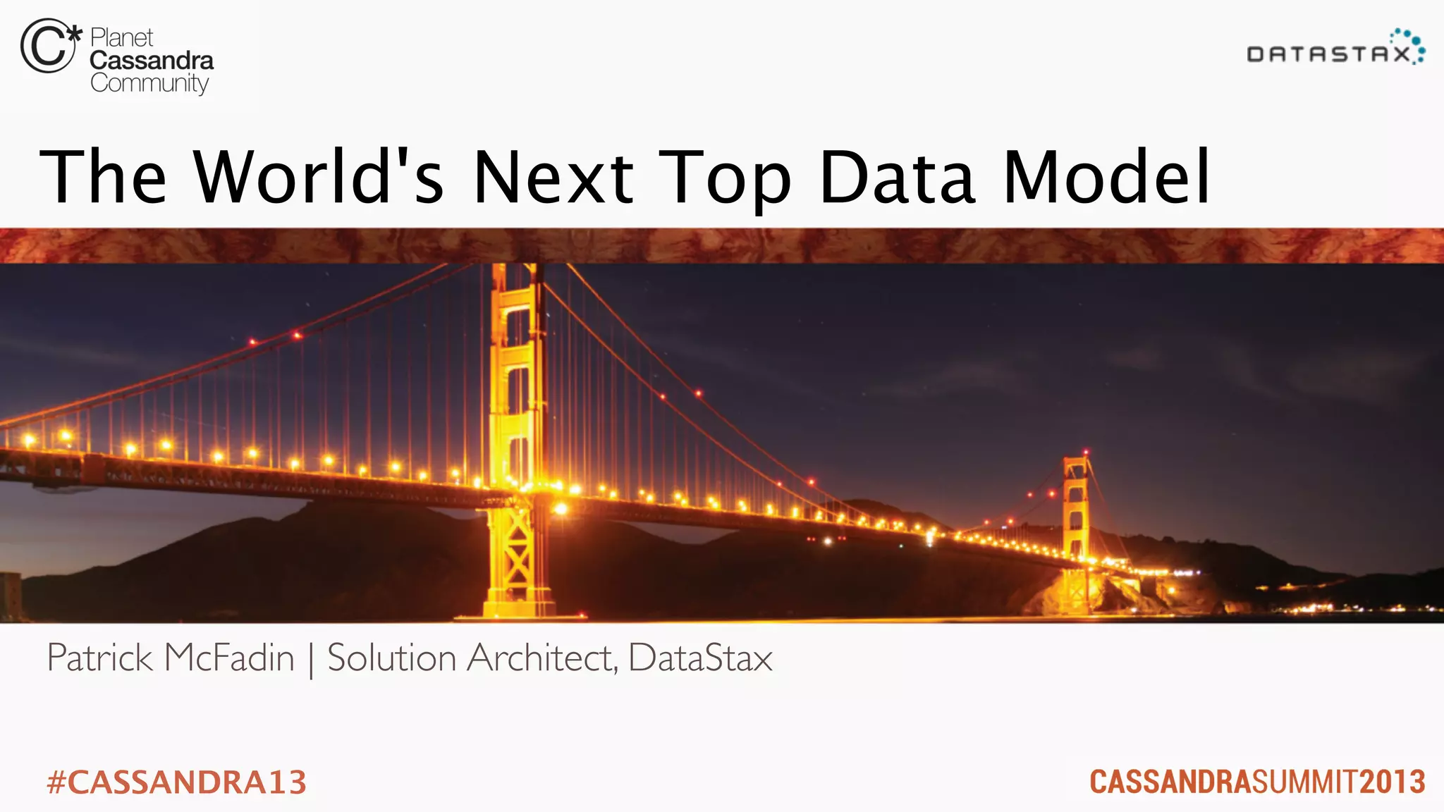 The document provides an overview and examples of data modeling techniques for Cassandra. It discusses four use cases - shopping cart data, user activity tracking, log collection/aggregation, and user form versioning. For each use case, it describes the business needs, issues with a relational database approach, and provides the Cassandra data model solution with examples in CQL. The models showcase techniques like de-normalizing data, partitioning, clustering, counters, maps and setting TTL for expiration. The presentation aims to help attendees properly model their data for Cassandra use cases.